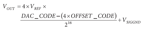 在使用2.5V電壓基準的時候,±5V標稱輸出可以發(fā)生偏移,產(chǎn)生−10V至 0V或0V至+10V輸出。但是使用5V基準電壓時,產(chǎn)生±10V標稱輸出,卻無法利用偏移DAC寄存器產(chǎn)生0V至+20V輸出,因為這超出了電源和裕量限制。DAC輸出電壓由以下公式?jīng)Q定,值得注意的是OFFSET寄存器是14位的,AD5362本身是16位的,所以需要將OFFSET_CODE乘以4。VSIGGND為相關(guān)SIGGND引腳上的電壓,通常為0V。