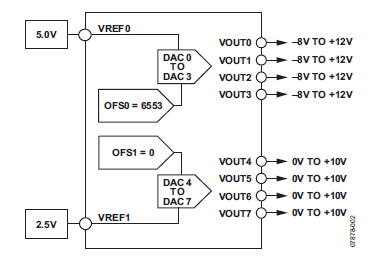 AD5362內(nèi)部有兩個OFFSET寄存器:OFS0和OFS1。OFS0控制DAC 0至DAC 3的偏移,OFS1控制DAC 4至DAC 7的偏移。AD5362內(nèi)部偏移DAC是14位的且默認值為0X2000,也就是8,192,跨度為基準電壓值的四倍。用戶理論上最多可以將輸出范圍上移或下移10V,不過輸出只能在電源和裕量要求的限制范圍內(nèi)調(diào)整。