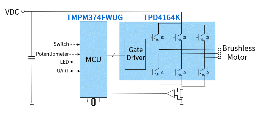 即日起用戶可訪問東芝官網(wǎng)獲取“無感直流無刷電機(jī)驅(qū)動電路參考設(shè)計”,該參考設(shè)計使用了新產(chǎn)品TPD4164K,以及帶有矢量控制引擎的TMPM374FWUG微控制器的相關(guān)功能。