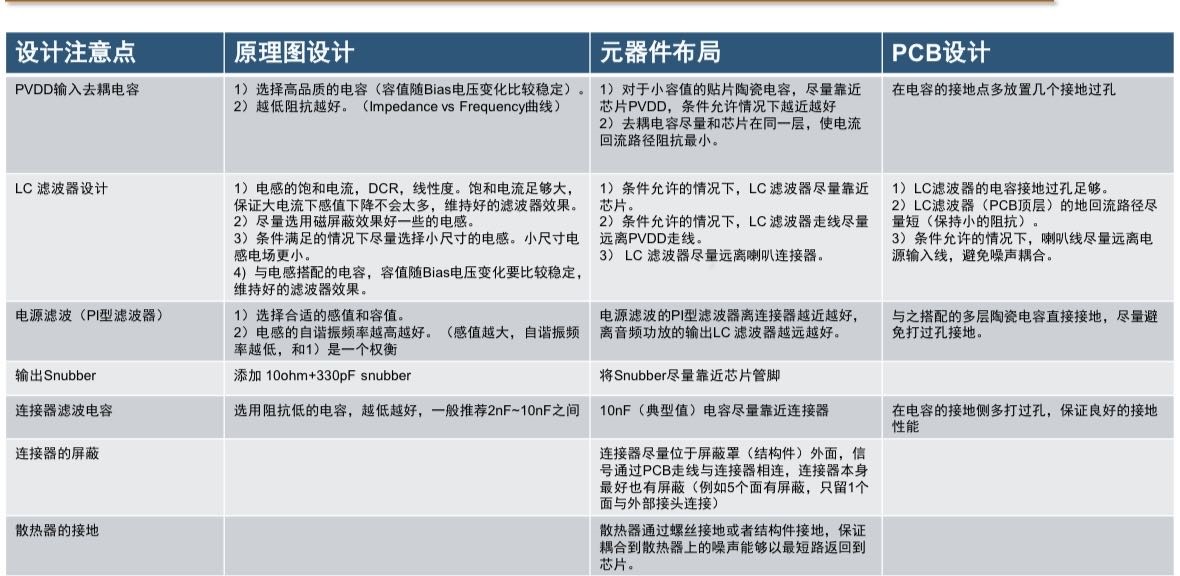 Layout注意事項(xiàng): LC filter 盡量靠近芯片來減少功放開關(guān)節(jié)點(diǎn)電磁輻射影響區(qū)域;盡量采用小尺寸的電感;讓 LC filter遠(yuǎn)離PVDD走線以及連接器;對(duì)連接器進(jìn)行屏蔽是最有效的方法。