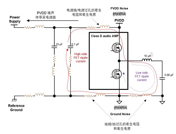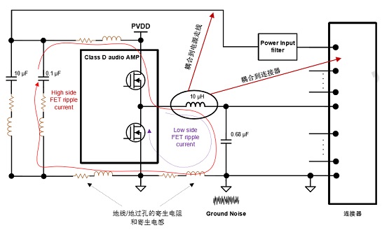 地噪聲來源分析:由于開關(guān)紋波電流流過寄生電感/電阻,造成參考地(Reference Ground)和功放地之間的電壓偏差。地噪聲會(huì)通過音頻功放傳導(dǎo)至喇叭線(或者其他走線)影響傳導(dǎo)/輻射測(cè)試結(jié)果。