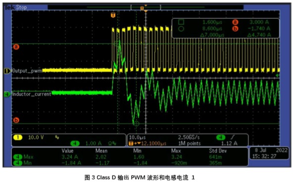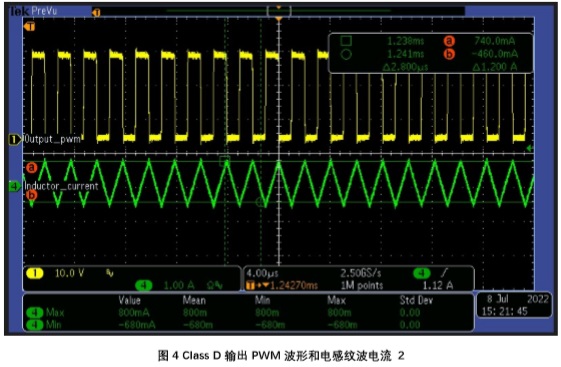 在上圖中綠色波形為流過電感電流,黃色波形為音頻功放輸出 PWM 波形。
