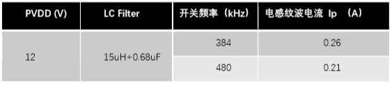 上面的表格列出了在不同的工作電壓下,使用不同的LC和PWM開關(guān)頻率下電感上的紋波電流。