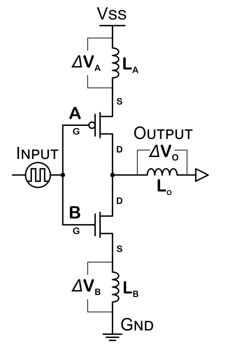 即使它們是電氣連接的,輸出和接地之間的電位差也不會立即處于 0 V。請記住,輸出之前處于 Vss,而 MOSFET B 的源極之前處于 0 V 電位。當輸出線放電時,先前的電位差將導致電流流動。