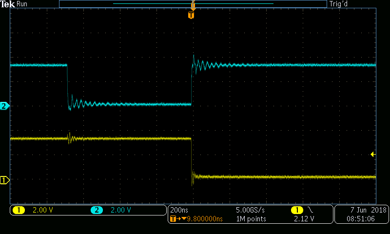 在圖 3 中,通道 2(上面以青色顯示)顯示無阻尼信號線中的接地和 Vss 反彈。該問題非常嚴重,以至于它會傳送到通道 1 上的另一條信號線(以黃色顯示)。