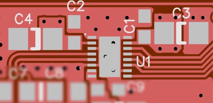 上圖所示為 IC (U1) 和四個電容器(C1、C2、C3、C4)的銅焊盤。C1和C2是用于高頻干擾的去耦電容器。根據(jù)數(shù)據(jù)表建議將 C3 和 C4 添加到電路中。由于其他平面的限制,過孔放置并不理想。