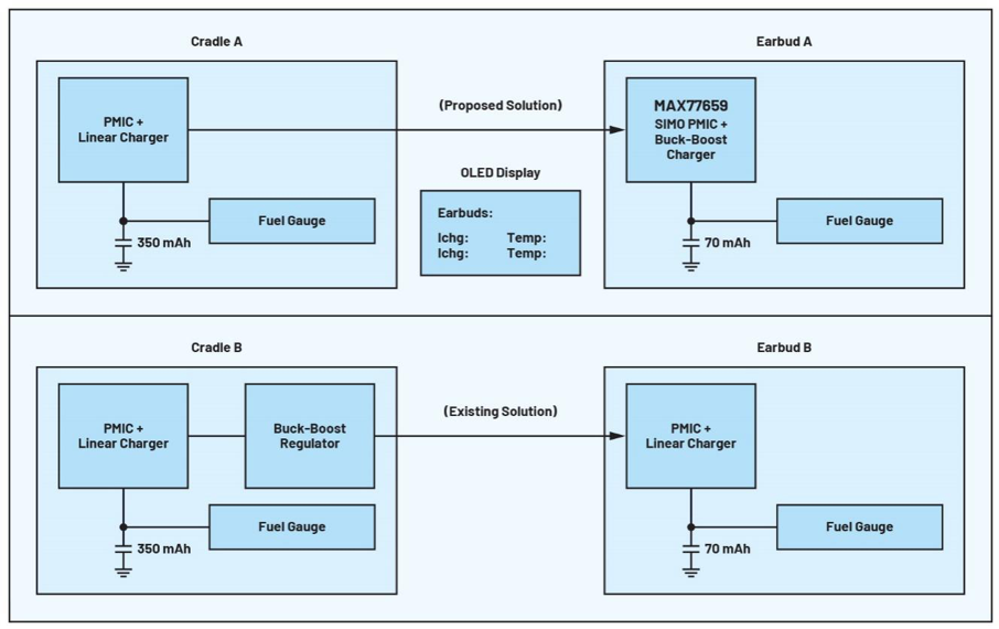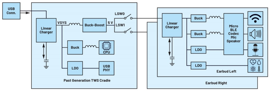 圖3.參考設(shè)計框圖,比較了TWS耳機的建議解決方案和傳統(tǒng)解決方案