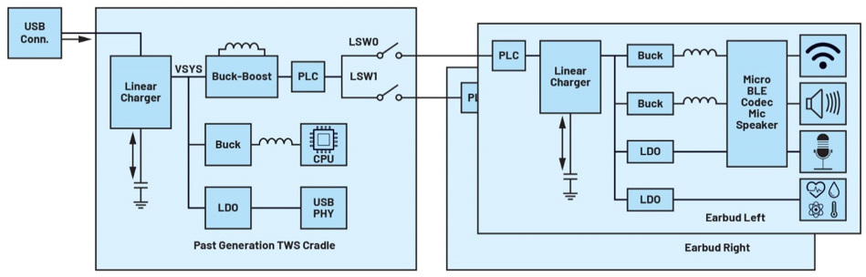 圖1b.帶PLC的TWS耳機應(yīng)用的典型電源架構(gòu)圖
