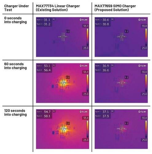 在2分鐘的測試過程中,線性解決方案的溫度升至58.1°C,而SIMO PMIC僅升至37.5°C;谶@些結(jié)果可知,與線性充電解決方案相比,SIMO解決方案能夠?qū)厣档图s72%。