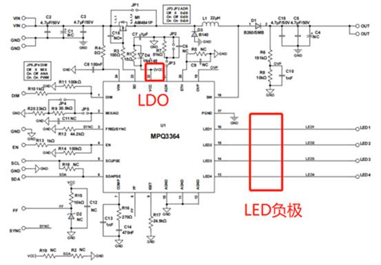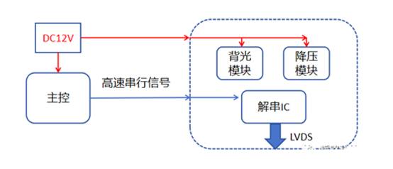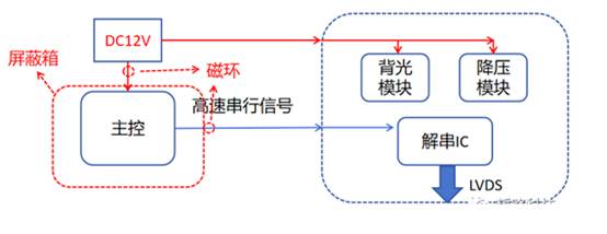 客戶的產(chǎn)品為一個顯示屏驅動電路,通過將主控傳輸過來的高速串行信號進行解碼,再傳送到顯示屏。主要模塊分為三部分,一個是背光升壓模塊,用于給背光供電,開關頻率為2.2MHz,一個是降壓模塊,給解串IC供電,開關頻率為500KHz,另一個是信號解串模塊,解串后輸出LVDS時鐘頻率為48MHz。簡單電路框架如下: