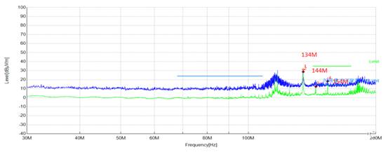 從上面的數(shù)據(jù)中可以看到,出現(xiàn)了10MHz間隔的頻率點,并且在154MHz頻點處超標。