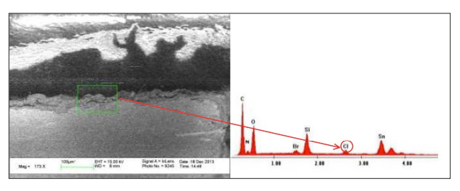 鹵化物是離子性的并且?guī)в须姾桑焕纾珻l‐、Br‐ 和 F‐。氯是電負(fù)性強(qiáng)的離子,該物質(zhì)通過 Vcc(電源)電勢引起的電場漂移遷移到封裝中。Vcc(電源)焊盤通常是個受到氯相關(guān)問題“攻擊”的焊盤。一般來說,GND(地)焊盤一般不會被腐蝕,因為該焊盤一般處于地電位或電位。Vcc(電源)焊盤通常是個受到氯相關(guān)問題“攻擊”的焊盤。一般來說,GND(地)焊盤一般不會被腐蝕,因為該焊盤一般處于地電位或電位。這表明不需要對鉛模具界面進(jìn)行分層以使離子污染物進(jìn)入。僅僅存在離子物質(zhì),在存在水分和電位差等加速因素的情況下,足以啟動離子污染過程。圖 1 顯示了環(huán)境中的氯離子如何進(jìn)入封裝并腐蝕焊盤的機(jī)制。圖 2 顯示在引線框架與模制化合物(未分層)之間的界面處發(fā)現(xiàn)了氯,圖圖3顯示了由于使用鹵化物助焊劑而導(dǎo)致的焊盤腐蝕。