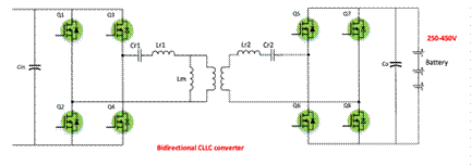DC-DC級(jí)通常采用隔離式拓?fù),使用變壓器提供隔離,主要目的是根據(jù)電池的充電狀態(tài)調(diào)節(jié)輸出電壓。盡管可以采用半橋拓?fù)洌?dāng)前主要采用雙有源橋(DAB)轉(zhuǎn)換器方案,例如諧振轉(zhuǎn)換器(比如LLC、CLLC)或相移全橋 (PSFB)轉(zhuǎn)換器。近來(lái),諧振轉(zhuǎn)換器,特別是LLC和CLLC,因其具備多項(xiàng)優(yōu)勢(shì)而受到廣泛關(guān)注,具體優(yōu)勢(shì)包括寬軟開關(guān)工作范圍、雙向工作能力以及將諧振電感和變壓器整合到單個(gè)功率變壓器中的便利性。