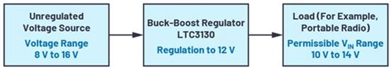 圖1所示為這類應用的系統(tǒng)示意圖。便攜式無線電設備由電池提供電壓。負載可以接受介于10 V和14 V之間的電壓,但電壓源的輸出范圍可能為8 V至16 V。那么內(nèi)插的降壓-升壓穩(wěn)壓器可以在輸出端將電壓轉(zhuǎn)換為12 V。如果電源電壓略低于12 V,轉(zhuǎn)換器采用升壓模式工作,如果電源電壓高于12 V,則采用降壓模式工作。