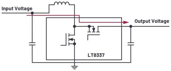 除了降壓-升壓解決方案(LT8210),升壓穩(wěn)壓器也支持直通模式。ADI公司新推出的 LT8337 Silent Switcher ® 升壓穩(wěn)壓器本身集成了直通模式。圖3展示了LT8337升壓轉(zhuǎn)換器背后的這一概念。啟用直通模式時,高端開關(guān)永久開啟,低端開關(guān)永久關(guān)閉。