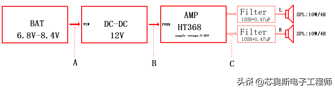 3). DC-DC輸出端的電解電容耐壓值應(yīng)該選取25V,包括功放供電腳的電容也一樣;