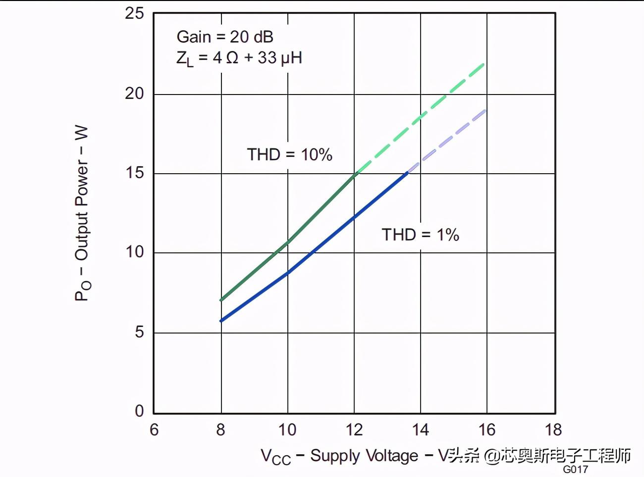 這里我們要求的功率是2*8W 失真1%,所以我們電壓我們這里可以設置一個12V即可滿足,如果失真過大,我們電壓是可以稍微調(diào)大一些的,當然是在功放供電電壓范圍內(nèi)。