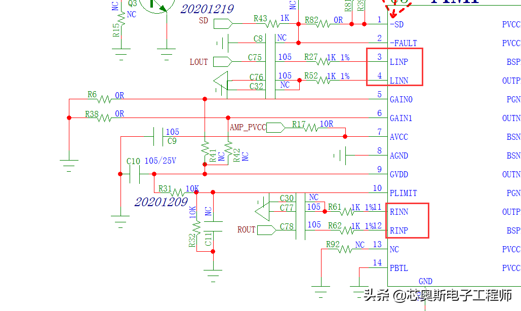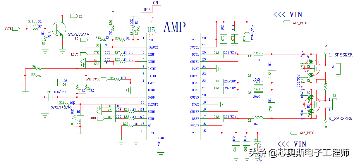 功放供電腳分PVCCL和PVCCR,不難看出是兩組獨立的供電,所以這兩個腳上放的電容一定要一樣,一定要平衡,這里可能就是很多小伙伴在做立體聲音響的時候,測試功率發(fā)現(xiàn)兩個聲道功率有相差的原因了。