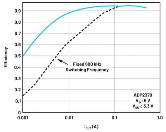 圖2.兩種情況下ADP2370降壓穩(wěn)壓器的電源轉(zhuǎn)換效率:一種是激活低負(fù)載省電模式,另一種是在所有負(fù)載下均使用固定的600 kHz開(kāi)關(guān)頻率。