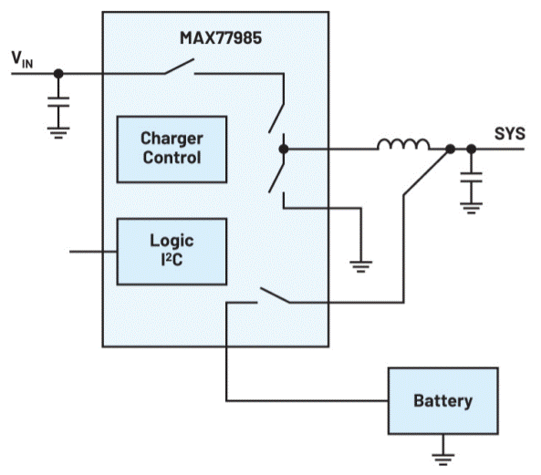 在許多不同的特性中,有一項(xiàng)特別值得注意。MAX77985中的集成電源開(kāi)關(guān)不僅可以在降壓模式下為電池充電,還可用于將電池電壓提升到更高的系統(tǒng)電壓。在某種程度上,這款電池充電器是系統(tǒng)電源轉(zhuǎn)換器與純電池充電器的組合。