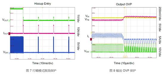 4. SGM61184 保護(hù)功能豐富,包括輸入欠壓鎖定(UVLO),高側(cè)和低側(cè)開(kāi)關(guān)管限流和打嗝模式保護(hù)(Hiccup),低側(cè)開(kāi)關(guān)管負(fù)向限流,輸出過(guò)壓保護(hù)(Output OVP),輸入過(guò)壓保護(hù)(Input OVP)以及過(guò)溫保護(hù)(OTP)。