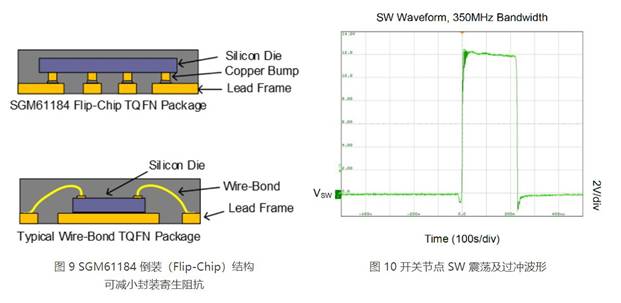 5. SGM61184 封裝采用倒裝結(jié)構(gòu)(Flip-Chip),能減小傳統(tǒng)打線(xiàn)方式(Wire Bonding)引入的寄生感抗,結(jié)合圣邦優(yōu)化的 MOSFET 驅(qū)動(dòng)技術(shù),有效減小了開(kāi)關(guān)節(jié)點(diǎn)的寄生震蕩,在減小內(nèi)部器件應(yīng)力的同時(shí),配合對(duì)稱(chēng)的 TQFN 封裝及 PCB 布局,能有效優(yōu)化器件的 EMI 特性。