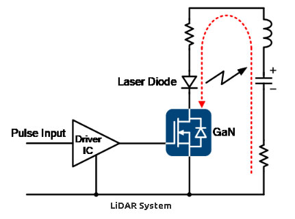 在激光雷達領(lǐng)域,氮化鎵器件的Qg、Qoss等參數(shù)相比硅器件提升1.5~3倍;與早期激光雷達產(chǎn)品相比,采用氮化鎵能夠?qū)㈤_關(guān)速度提升13倍,脈沖寬度減小五分之一。當前,L2輔助駕駛使用MOS方案識別距離只有100m,L2+/L3輔助駕駛必須達到200m/300m的中遠距離識別,只有使用窄脈沖、大峰值電流、高功率的氮化鎵方案,才能為自動駕駛激光雷達提供高性能保障。