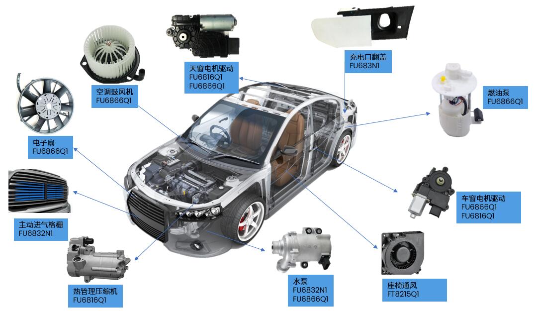 FU6866Q1溫度等級(jí)為 Grade 1,芯片工作時(shí)TJ(-40 –150 ℃),TA(-40 –125 ℃),可以廣泛應(yīng)用在車身控制的相關(guān)電機(jī)控制領(lǐng)域中,包括熱管理系統(tǒng)水泵、電子扇、玻璃升降控制、座椅電機(jī)控制、尾門電機(jī)等。