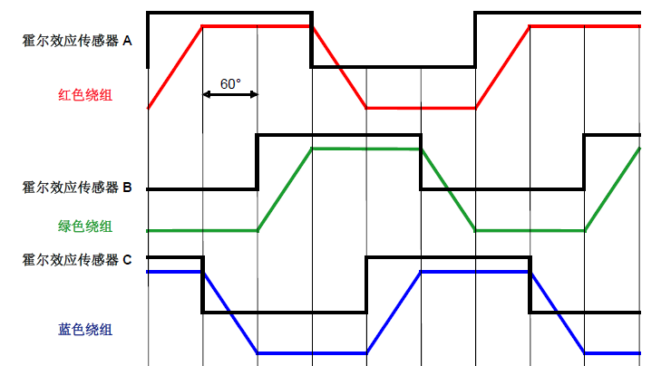 HallA、HallB、HallC是三個霍爾傳感器,安裝在電機(jī)不一樣的部位,用于檢驗(yàn)相對性于三個繞組(A/B/C)的轉(zhuǎn)子部位。在電機(jī)運(yùn)行全過程中,當(dāng)順向的磁感線越過霍爾傳感器,感應(yīng)器輸出“1”,相反,輸出“0”。因?yàn)?個霍爾傳感器勻稱安裝在360度電角度,當(dāng)電機(jī)運(yùn)行一個電氣設(shè)備周期時間(360)時,每一個霍爾傳感器的脈沖信號會產(chǎn)生2次旋轉(zhuǎn),一共產(chǎn)生6次脈沖信號旋轉(zhuǎn),因?yàn)楦袘?yīng)器是分布均勻的,因此每一次旋轉(zhuǎn)恰好相距60度電角度,這更是電機(jī)2次換相相距的電角度。根據(jù)持續(xù)載入霍爾傳感器不一樣的脈沖信號旋轉(zhuǎn)時刻,隨后給相對的繞組接電源,電機(jī)就可以穩(wěn)定的運(yùn)行起來。