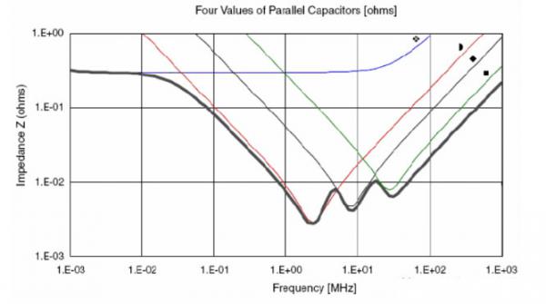 用一個電容組合的例子。這個組合使用的電容為:2個680uf鉭電容,7個2.2uf陶瓷電容(0805封裝),13個0.22uf陶瓷電容(0603封裝),26個0.022uf陶瓷電容(0402)。圖中上部平坦的曲線是680uf電容的阻抗曲線,其它三個容值的曲線為為圖中三個V字曲線,從左到右2.2uf →0.22uf→ 0.022uf?偟淖杩骨為底部粗包路線。