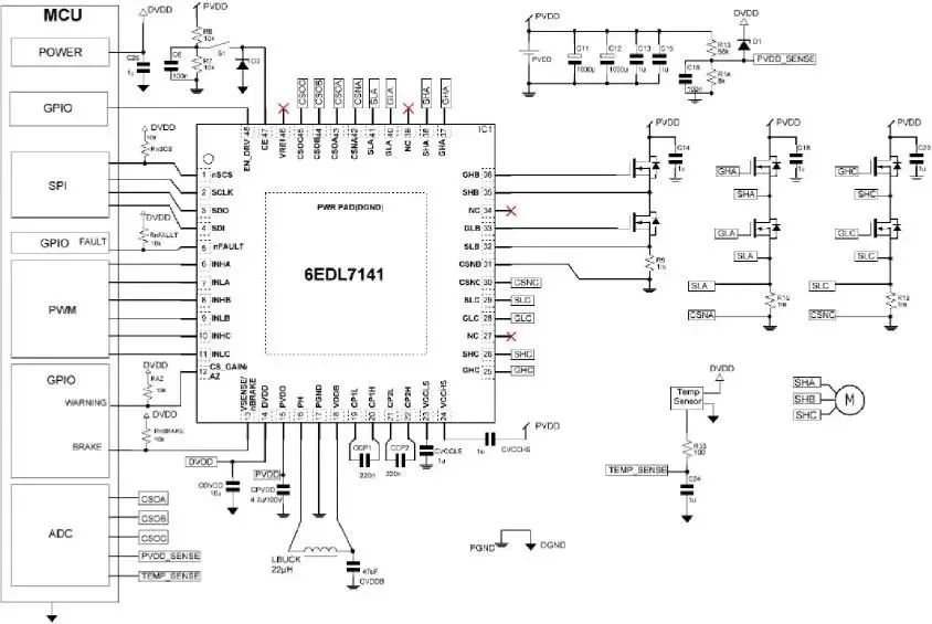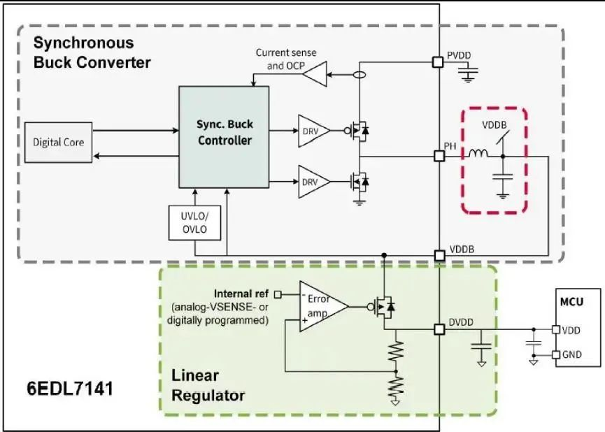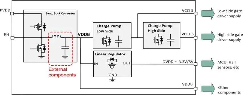 圖 3、圖 4 可以看到,MOTIX™ 6EDL7141 內(nèi)部集成高效同步 Buck DC-DC 轉(zhuǎn)換器為整個系統(tǒng)提供高壓供電,輸入電壓范圍寬至 5.5-60V,如果當(dāng) PVDD ≥9.5V,VDDB 能夠提供高達(dá) 600mA 的電流,同時配備由Buck 轉(zhuǎn)換器輸出供電的 LDO 穩(wěn)壓器可提供高達(dá) 300mA 的低噪聲數(shù)字電源。作為系統(tǒng)級設(shè)計時,可以靈活選擇供電方式,如:Buck 或 LDO 輸出為外部組件(MCU、霍爾等)供電,為配套的 MCU 提供電源,從而省去了所需要的電源配置。