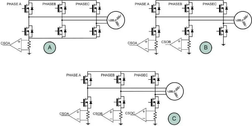 圖 8 支持單(A)、雙(B)和三(C)組并聯(lián)電流檢測配置
