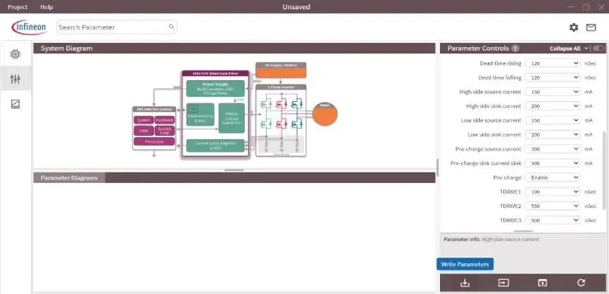 英飛凌為電機(jī)驅(qū)動控制設(shè)計提供了 GUI 工具,用戶可以通過 GUI 界面實現(xiàn)器件的選擇,參數(shù)的任意配置,這些只需要通過參數(shù)寫入即可以實現(xiàn)可視化的參數(shù)配置和效果,大大簡化和節(jié)約設(shè)計時間。調(diào)節(jié)后的參數(shù)可以存儲在 OTP 中。完成 OTP 操作后,還可以通過 SPI 命令更改一些配置,6EDL7141 提供高達(dá) 50 個參數(shù)可以通過 SPI 配置。