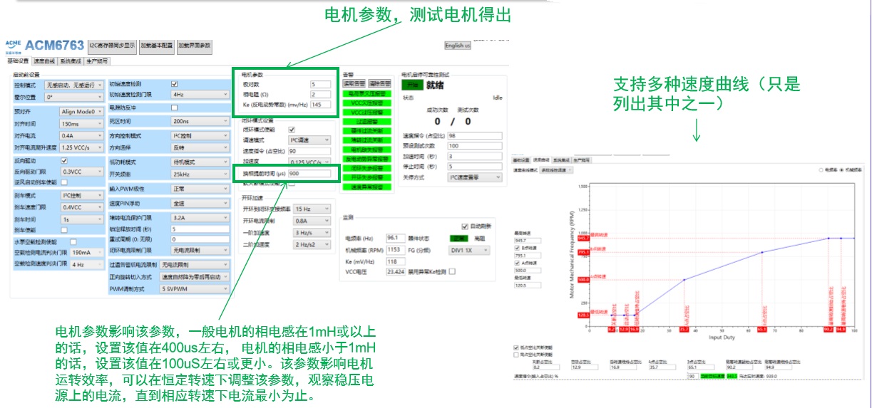 1)控制方式1, 直接的I2C寄存器控制。 利用系統(tǒng)上的MCU 對ACM6763進(jìn)行初始化( 配置電機(jī)的參數(shù), 如相電阻, Ke ,換相提前角,啟動加速度,閉環(huán)加速度,初始速度等 )或者其他控制( 調(diào)速,正反轉(zhuǎn),剎車等 )。 2)控制方式2, 硬件pin控制。SPEED pin支持外部的電壓,PWM占空比,PWM頻率等調(diào)速方式;DIR pin控制電機(jī)的正反轉(zhuǎn);BRAKE pin支持剎車。