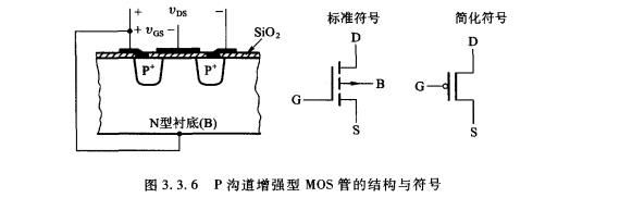 P 溝道增強(qiáng)型 MOS 管的符號如圖3.3.6中所示,其中襯底上指向外部的箭頭表示導(dǎo)電溝道為 P型!
