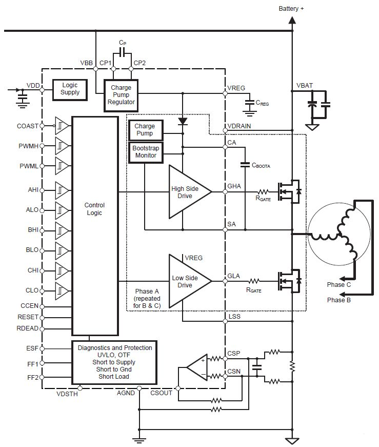 該器件可實現(xiàn)對三相橋中所有六個功率 FET 的全面控制,從而可通過塊整流或正弦激勵驅(qū)動電動機。集成交叉控制與電阻可調(diào)無感時間可使功率 FET 免于擊穿。