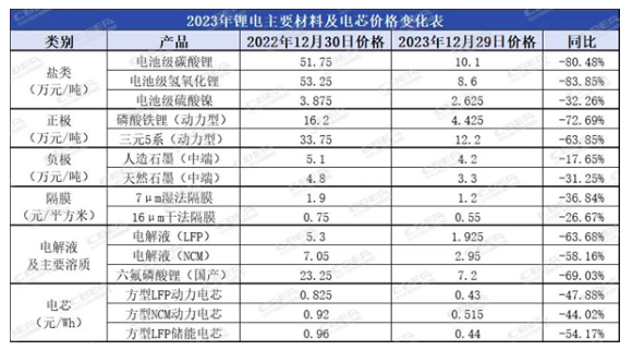依此,用“風(fēng)云突變”來形容鋰電原材料和電芯的2023年價(jià)格走勢一點(diǎn)不為過。在此背景下,我們分別從鋰電上游原材料、正負(fù)極、隔膜、電解液、電芯等角度,回顧鋰電產(chǎn)業(yè)鏈價(jià)格“跌宕”的2023年,并借此研判2024年產(chǎn)業(yè)發(fā)展格局。