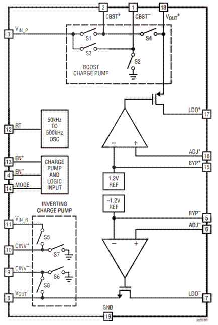 圖2 - ADI LTC3265的內(nèi)部看是電荷泵架構(gòu)+LDO架構(gòu),實(shí)現(xiàn)了穩(wěn)定的正、負(fù)電源輸出。