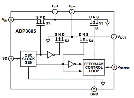 圖3 - ADI ADP3605的內(nèi)部架構(gòu)看是電荷泵架構(gòu)通過增加輸出反饋調(diào)節(jié)環(huán)路控制開關(guān)的導(dǎo)通電阻來調(diào)節(jié)穩(wěn)定輸出。
