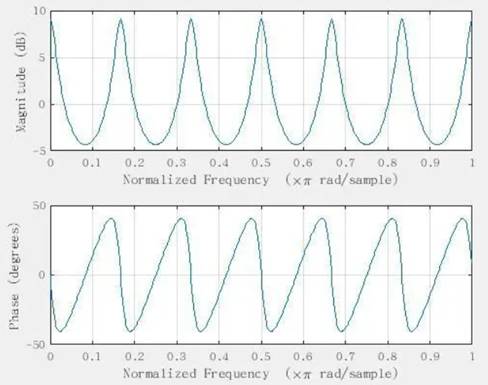 在頻域上,系統(tǒng)對頻率具有周期響應(yīng),且具備最大值與最小值,這樣我們將會得到像梳子一樣的波形圖,如下圖(圖4)所示,因此也被稱為梳狀濾波器。