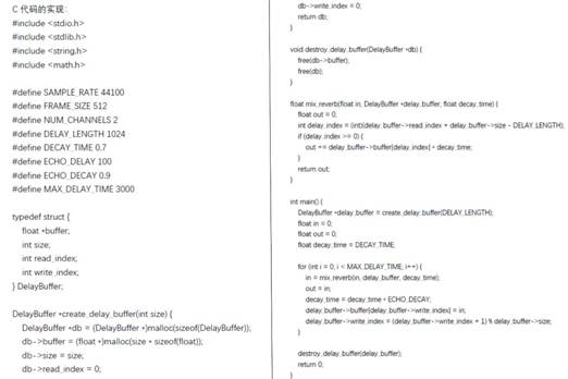 如上圖(圖14)所示的代碼是一個簡單的DSP混響效果實現(xiàn),它使用了C語言進(jìn)行編程。代碼主要有以下操作:
