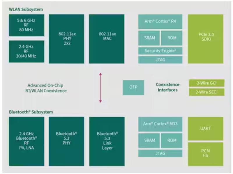 類似的 CYW55573 系列產(chǎn)品可提供 Wi-Fi 6/6E 三頻 Wi-Fi 連接(2.4 GHz、5 GHz 和 6 GHz),使其與 CYW55572 有所不同。