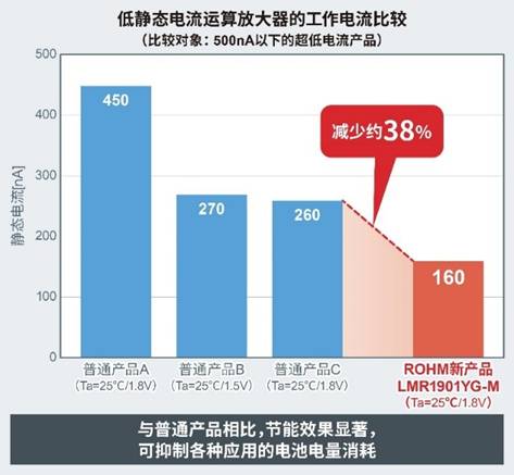新產(chǎn)品采用ROHM自有的超低靜態(tài)電流技術(shù),徹底抑制了因溫度和電壓變化而導(dǎo)致的電流增加問題,與普通的低靜態(tài)電流運算放大器相比,靜態(tài)電流減少約38%,僅為160nA(Typ.)。這不僅可延長由內(nèi)置電池供電的電子貨架標(biāo)簽等應(yīng)用的使用壽命,還有助于延長配備充電電池的智能手機等應(yīng)用的續(xù)航時間。另外,在-40℃~+105℃的工作溫度范圍內(nèi),靜態(tài)電流幾乎不變,因此即使在火災(zāi)報警器和環(huán)境傳感器等外部溫度會發(fā)生變化的環(huán)境中,也能穩(wěn)定地省電運行。