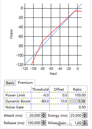 DRC在音頻算法中是非常核心的模塊,英文全稱dynamic range control,作用是調(diào)整音頻信號的動態(tài)范圍,根據(jù)輸入信號的大小自動調(diào)整增益;究梢缘脑O(shè)置參數(shù)如下: