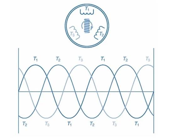 現(xiàn)在,請注意圖 3 中定子中的三個獨立的相繞組。相繞組圍繞定子外殼按順序排列。當所施加的三相功率在T1相的正方向上達到峰值時,相繞組T2和T3將具有相反的極性,并且它們的值將在0和它們的負值之間。當 T2 相在其正方向上達到峰值時,T1 和 T3 將具有相反的極性,并且它們的值將在 0 和負值之間。這種模式在所施加的交流正弦波的整個 360° 旋轉中持續(xù)存在。