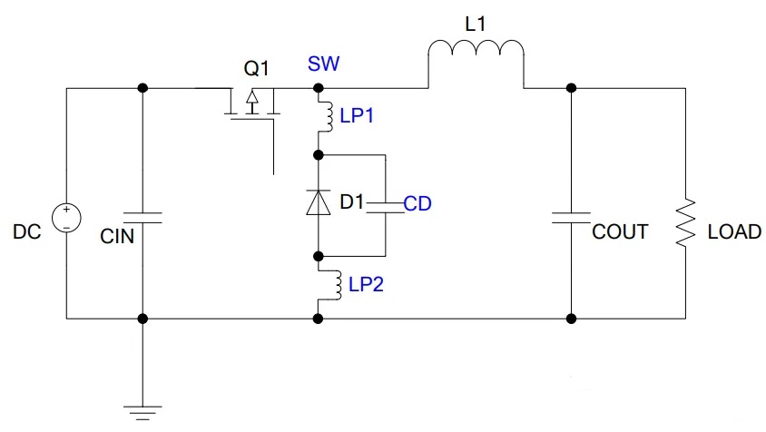 不論功率管 Q1 打開還是關(guān)斷,電流均流過 L1 和 COUT,表明流過 L1 和 COUT 處電流是連續(xù)電流, 流過 CIN、Q1、D1 的電流是開關(guān)電流,開關(guān)電流會(huì)在寄生電感上產(chǎn)生毛刺電壓,對外輻射電磁波。