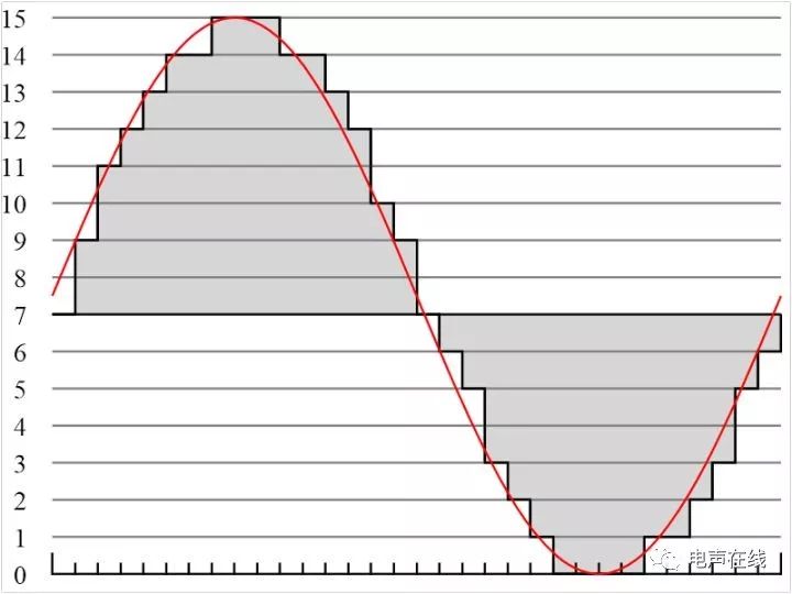下圖反映了數(shù)字電路在采樣過程中呈現(xiàn)的波形,一個(gè)臺(tái)階可以看作是一次采樣,顯然,這些采樣臺(tái)階7越多,就越接近原來的正弦波形。
