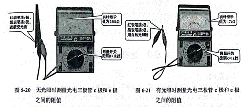 在進(jìn)行受光檢測(cè)時(shí),萬(wàn)用表仍選擇R×1k擋,黑表筆接c極,紅表筆接e極,讓光線照射光電三極管受光面,正常光電三極管阻值應(yīng)變小。在無(wú)光和受光檢測(cè)時(shí)阻值變化越大,表明光電三極管靈敏度越高,如圖6—20、圖6—21所示。