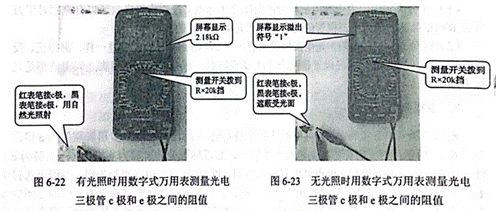 若采用數(shù)字式萬(wàn)用表檢測(cè),則可將測(cè)量開(kāi)關(guān)置于R×20k擋,紅表筆接c極,黑表筆接e極,有光照時(shí),屏幕顯示的電阻值應(yīng)在10kQ以下;無(wú)光照時(shí),屏幕顯示的數(shù)字應(yīng)為溢出符號(hào)“1”,如圖6—22、圖6—23所示。