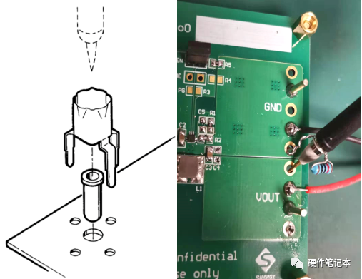 但這仍然不是真正的開(kāi)關(guān)穩(wěn)壓器的輸出紋波。這是因?yàn)槭静ㄆ鞯奶綔y(cè)尖端測(cè)量的是EVB板的輸出,其到開(kāi)關(guān)穩(wěn)壓器的輸出之間的走線存在著寄生電感。為了測(cè)量開(kāi)關(guān)穩(wěn)壓器真正的輸出紋波,我們建議改為直接在輸出電容上進(jìn)行探測(cè),如圖7所示。